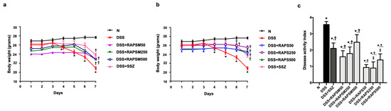 RAPSM and RAPS reduced symptomatic manifestations in DSS-induced UC mice. (a) Effect of RAPSM on BW, (b) effect of RAPS on BW, and (c) DAI score. Data are expressed as ± S.E.M (n = 8 per group). * p < 0.05 vs. N; † p < 0.05 vs. DSS; and ‡ p < 0.05 vs. DSS + RAPSM at the same dose. RAPSM: rosmarinic acid-enriched perilla seed meal extract; RAPS: rosmarinic acid-enriched perilla seed extract; DSS: dextran sulfate sodium; UC: ulcerative colitis; BW: body weight; and DAI: disease activity index.