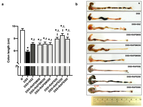 Similarly, treatment with sulfasalazine (SSZ) reduced colon length shortening in DSS-induced UC mice, consistent with the administration of all doses of RAPSM and RAPS. The representative gross appearance of colon length is shown in Figure 3b. The results suggested that pretreatment with RAPSM and RAPS prevented the severity of UC by reducing colon length shortening.