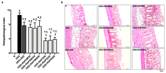 Mice treated with DSS had a shortening of the colon, suggesting that UC conditions were observed in this group (Figure 3). In comparison, pretreatment with RAPSM and RAPS at all doses significantly reduced colon length shortening (Figure 3a). At similar doses, pretreatment with RAPS showed better efficacy than RAPSM in alleviating colon length shortening at all doses (Figure 3a). However, pretreatment with RAPSM and RAPS at 50 mg/kg resulted in equally improved colon lengths compared to the DSS group (Figure 3a).