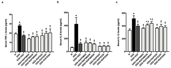 The results showed that serum TNF-α, IL-6, and IL-1β levels were significantly elevated in the DSS-treated mice compared to the mice in the N group (Figure 5a–c). This indicates that UC was successfully induced in mice through an increase in proinflammatory cytokines after 7 days of treatment with DSS (Figure 5a–c). Pretreatment with RAPSM and RAPS at all doses reduced TNF-α and IL-6 in the serum of DSS-treated mice to normal levels (Figure 5a,b). Pretreatment with RAPS reduced the serum IL-1β levels at all doses; however, only pretreatment with RAPSM at a dose of 50 mg/kg reduced serum IL-1β to a normal level in the DSS-treated mice (Figure 5c). Pretreatment with RAPSM at doses of 250 and 500 mg/kg decreased serum IL-1β levels in these mice (Figure 5c). The data suggest that pretreatment with RAPSM and RAPS at a dose of 50 mg/kg was sufficient to restore the serum TNF-α, IL-6, and IL-1β levels of the DSS-treated mice to normal levels (Figure 5a–c). Treatment with SSZ decreased the levels of serum TNF-α, IL-6, and IL-1β in the DSS-treated mice (Figure 5a–c).