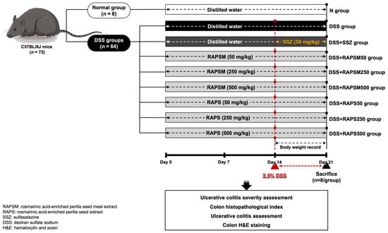 Schematic overview of experimental protocol. RAPSM: rosmarinic acid-enriched perilla seed meal extract; RAPS: rosmarinic acid-enriched perilla seed extract; SSZ: sulfasalazine; and DSS: dextran sulfate sodium.