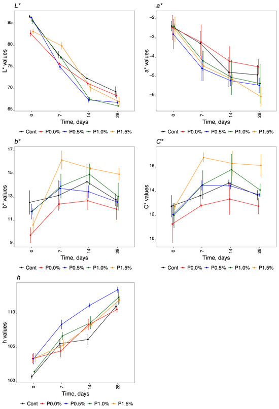 Instrumental colour analysis evaluating the CIELAB method and cylindrical coordinates for the different parameters during storage time. L*, luminosity; a* and b* chromaticity coordinates; h, hue, and C*, chroma.