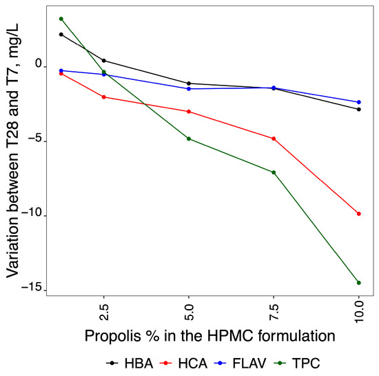 Figure 4 shows the variation of TPCs over time (T7 and T28) for HPMC formulations containing 0.00, 1.25, 2.50, 5.00, 7.50 and 10.00% propolis. The quantification of the three classes of TPC [hydroxybenzoic acids (HBA), hydroxycinnamic acids (HCA), and flavonoids (FLAV)] used for the different formulations (P1.25, P2.50, P5.00, P7.50 and P10.00%) was carried out using standard mixed solutions of gallic acid, ferulic acid, and quercetin, as reported in Table 4.