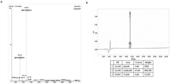 Mass spectrometry and HPLC analysis of peptide Rqdl10. (A) Mass spectrometry analysis of peptide Rqdl10; (B) HPLC analysis of peptide Rqdl10.