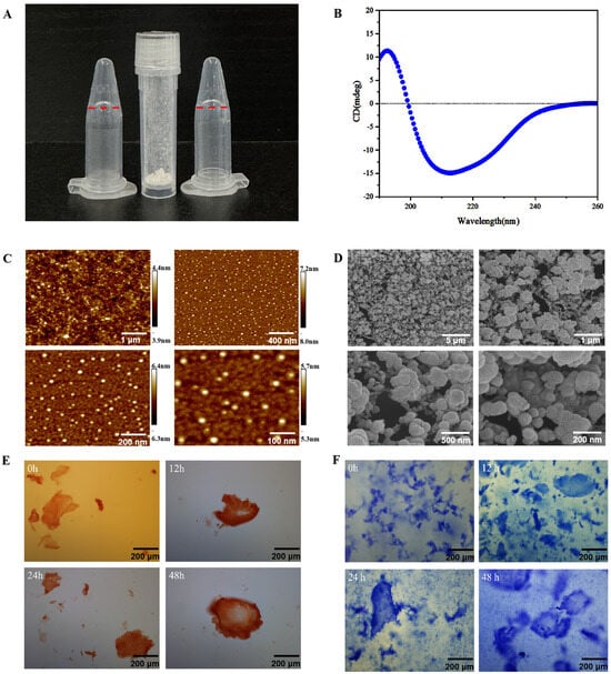 Characterization of Rqdl10 hydrogel. (A) Hydrogel formed by self−assembling peptide Rqdl10,The red line represents the lower edge of Rqdl10 hydrogel; (B) Circular dichroic analysis of Rqdl10 hydrogel; (C) Atomic force microscopy (AFM) analysis of Rqdl10 hydrogel; (D) Cryogenic scanning electron microscopy (cryo-SEM) analysis of Rqdl10 hydrogel; (E) Congo red staining results of Rqdl10 hydrogel at 0 h, 12 h, 24 h and 48 h; (F) aniline blue staining results of Rqdl10 hydrogel at 0 h, 12 h, 24 h and 48 h.