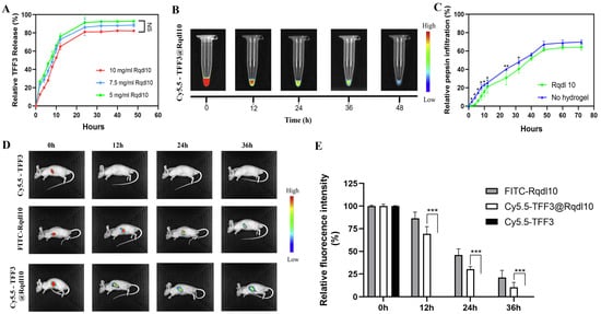 Cy5.5 dye was dissolved in DMF at a concentration of 12.56 mM. TFF3 (5 µg/µL) solution was prepared in pure water; then, Cy5.5 dye was added to the TFF3 solution at a molar ratio of 3:1 (Cy5.5:TFF3) and incubated for 30 min at 37 °C in a thermostat protected from light. Free dye was removed using 3KD ultrafiltration tubes. Cy5.5-TFF3@Rqdl10 (Rqdl10 10 mg/mL) was prepared as previously described. Next, 50 µL of Cy5.5-TFF3@Rqdl10 was placed in a 1.5 mL EP tube, and 200 µL of PBS was then added. At the indicated time points (0 h, 12 h, 24 h, 36 h, 48 h), the supernatant was removed and Cy5.5-TFF3@Rqdl10 in the EP tube was visualized using an in vivo imaging system (VILBER, Collégien, France).