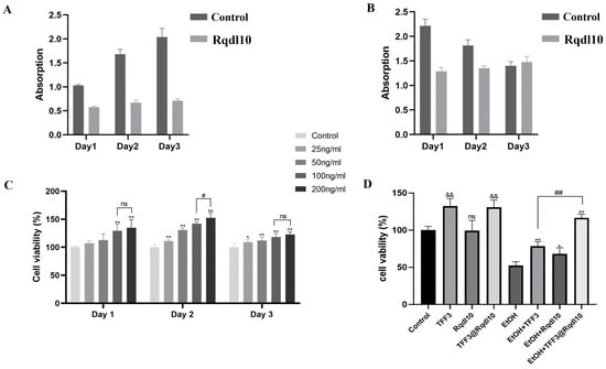 Determination of cell viability of GES−1 under different treatments. (A) Proliferation assay of GES-1 cells in Rqdl10 hydrogel matrix; (B) Cytotoxicity assay of GES-1 cells in Rqdl10 hydrogel matrix; (C) Optimal concentration of TFF3 to promote GES-1 proliferation,* p < 0.05,** p < 0.01 (vs. control group), # p < 0.05, ns means no statistical significance; (D) Effect of TFF3, Rqdl10 hydrogel, and TFF3@Rqdl10 treatment on GES-1 cell viability in the presence or absence of ethanol. && p < 0.01 (vs. control group), * p < 0.05, ** p < 0.01 (vs. EtOH Group), ## p < 0.01. Statistics for each group are expressed as mean ± SD (n = 6).