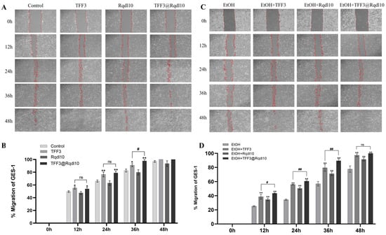 Effect of TFF3, Rqdl10 hydrogel, and TFF3@Rqdl10 treatment on GES−1 cell migration in the presence or absence of ethanol. (A) The scratch assay on GES−1 cell migration in treatment with TFF3, Rqdl10 hydrogel, and TFF3@Rqdl10 at different incubation times; (B) Migration rate of GES-1 cells after treatment with TFF3, Rqdl10 hydrogel, and TFF3@Rqdl10, * p < 0.05, ** p < 0.01 (vs. control group), # p < 0.05, ns means no statistical significance; (C) The scratch assay on GES−1 cell migration in treatment with TFF3, Rqdl10 hydrogel, and TFF3@Rqdl10 at different incubation times in ethanol environment; (D) Migration rate of GES−1 cells after treatment with TFF3, Rqdl10 hydrogel, and TFF3@Rqdl10 in ethanol environment.** p < 0.01 (vs. EtOH Group), # p < 0.05, ## p < 0.01, ns means no statistical significance. Statistics for each group are expressed as mean ± SD (n = 4).