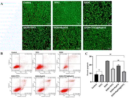 Apoptosis detection in GES-1 cells. (A) The live/dead staining of GES-1 cell treatment with TFF3, Rqdl10 hydrogel, and TFF3@Rqdl10; (B) Flow cytometric analysis for quantification of apoptotic cells; (C) Percentage of apoptotic GES−1 cells. ** p < 0.01 (vs. EtOH Group); ## p < 0.01; ns means no statistical significance. Statistics for each group are expressed as mean ± SD (n = 4).