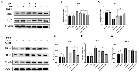 The impact of TFF3@Rqdl10 on apoptosis and inflammation-related protein expression in GES−1 cells after ethanol-induced injury. (A) WB analysis of Bax and Bcl2 in GES-1 cells after ethanol injury. Relative protein level of Bax (B) and Bcl2 (C), ** p < 0.01 (vs. EtOH group), ## p < 0.01, ns means no statistical significance; (D) WB analysis of TNF-α, IL-6, and NF-κB in GES-1 cells after ethanol injury; Relative protein level of TNF-α (E), IL-6 (F), and NF-κB (G), ** p < 0.01 (vs. EtOH group), # p < 0.05, ## p < 0.01, ns means no statistical significance. Statistics for each group are expressed as mean ± SD (n = 6).