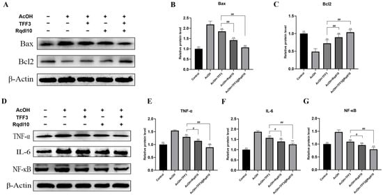 The impact of TFF3@Rqdl10 on apoptosis and inflammation−related protein expression after acetic acid injury in rat gastric mucosa. (A) WB analysis of Bax and Bcl2 in gastric tissue after acetic acid injury. Relative protein level of Bax (B) and Bcl2 (C), ** p < 0.01 (vs. EtOH group), ## p < 0.01, ns means no statistical significance; (D) WB analysis of TNF-α, IL-6, and NF-κB in gastric tissue after acetic acid injury; Relative protein level of TNF-α (E), IL-6 (F), and NF-κB (G), ** p < 0.01 (vs. AcOH group), # p < 0.05, ## p < 0.01, ns means no statistical significance. Statistics for each group are expressed as mean ± SD (n = 6).