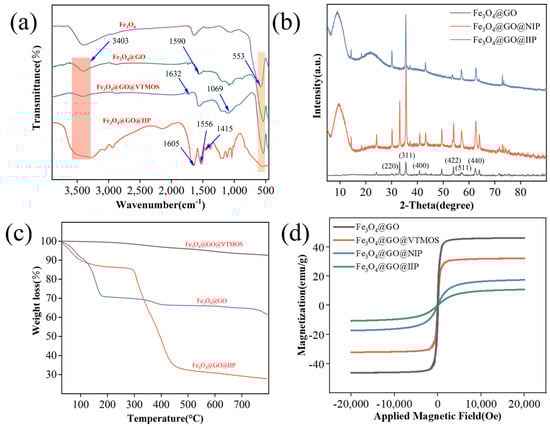 (a) FT−IR spectra of Fe3O4, Fe3O4@GO, Fe3O4@GO@VTMOS, and Fe3O4@GO@IIP. (b) The XRD pattern of Fe3O4@GO, Fe3O4@GO@IIP and Fe3O4@GO@NIP. (c) The TGA curves for Fe3O4@GO, Fe3O4@GO@VTMOS, and Fe3O4@GO@IIP. (d) The VSM curves for Fe3O4@GO, Fe3O4@GO@VTMOS, Fe3O4@GO@NIP, and Fe3O4@GO@IIP.