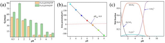 Considering that Cr(VI) undergoes hydrolytic ionization under acidic conditions, the impact of Fe3O4@GO@IIP/ Fe3O4@GO@NIP on the adsorption capacity of 100 mg/L of chromium(VI) at various pH levels at room temperature was examined, as depicted in Figure 3a. The adsorption capacity of chromium(VI) increased gradually with decreasing pH, peaking at 89.18 mg/g at a pH = 1. Zeta potential analysis of Fe3O4@GO@IIP indicated that the surface of the Fe3O4@GO@IIP adsorbent became positively charged when the pH was below 6.8 (Figure 3b). As the pH decreased, chromium(VI) existed in various forms such as CrO42−, HCrO4−, Cr2O72−, and H2CrO4 (Figure 3c). At a pH = 1, 80% of the chromium(VI) was in the form of HCrO4−, facilitating electrostatic attraction with the negatively charged HCrO4− in the acidic solution [27]. The adsorption capacity decreased after the pH dropped below 1 because at a pH = 0.5, Cr(VI) existed as 50% H2CrO4 and 50% HCrO4−, leading to a reduction in the electrostatic effect due to the decrease in HCrO4−, resulting in a decline in the adsorption capacity. The maximum adsorption capacity of Fe3O4@GO@NIP was lower than that of Fe3O4@GO@IIP (52.89 mg/g), attributed to the presence of more adsorption sites on the loose and porous surface of Fe3O4@GO@IIP. Experimental findings demonstrated that the optimal adsorption efficiency of Fe3O4@GO@IIP was achieved at a pH = 1.
