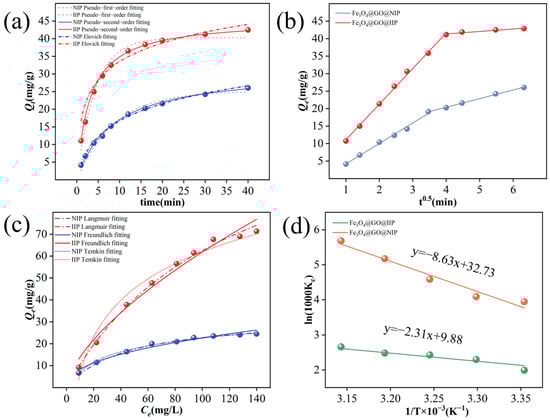 The kinetic fitted curve is depicted in Figure 4a, and the relevant parameters are detailed in Table 1. The correlation coefficients of the Fe3O4@GO@IIP and Fe3O4@GO@NIP pseudo-second models (R22IIP = 0.9963 and R22NIP = 0.9912) surpassed those of the pseudo-first models (R12IIP = 0.9879 and R12NIP = 0.9818) and the Elovich models (R32IIP = 0.9554 and R32NIP = 0.9820). Furthermore, the computed values of Fe3O4@GO@IIP’s and Fe3O4@GO@NIP’s pseudo-second simulations (Qe,IIP = 42.21 mg/g and Qe,NIP = 25.80 mg/g) align more closely with the experimental values (Qe,IIP = 42.80 mg/g and Qe,NIP = 26.02 mg/g). These findings collectively suggest that the adsorption process adheres to pseudo-secondary kinetics and is primarily governed by chemisorption.