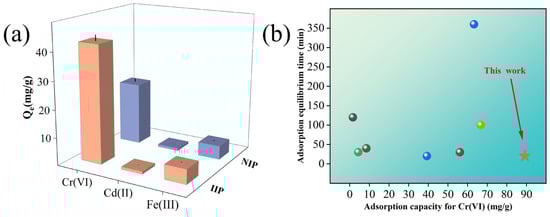 To further validate the advantages of the prepared adsorbents, we compared them with previously reported adsorbents in terms of their adsorption capacity and adsorption time for Cr(VI) removal [15,18,37,38,39,40,41]. As shown in Figure 5b, our study achieved a maximum adsorption capacity of 89.8 mg/g and a fast equilibration time of 20 min at 25 °C and pH 1, which exceeded the performance of most previous adsorbents. In addition, the high selectivity of our adsorbent allows it to resist interference from other ions in complex aqueous solutions, while its magnetic properties facilitate simple and rapid subsequent separations by applying an external magnetic field. This is because the use of surface imprinting technology can make the surface of the imprinted material have more adsorption sites, facilitating a reduction in mass transfer and ion transmission during contact with the sites. In conclusion, this material has the potential for the selective separation of Cr(VI).