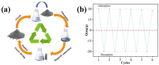 A significant advantage of Fe3O4@GO@IIP over conventional adsorbents is its superior regeneration performance, particularly in the presence of a magnetic field, facilitating the easy separation and recycling of the magnetic adsorbent. This characteristic leads to cost savings and economic benefits. The regeneration process is depicted in Figure 7a, where metal ions are desorbed from the adsorbent, enabling its reuse in subsequent adsorption cycles. As demonstrated in Figure 7b, Fe3O4@GO@IIP consistently maintained stable adsorption efficiency for Cr(VI) across multiple regeneration cycles.