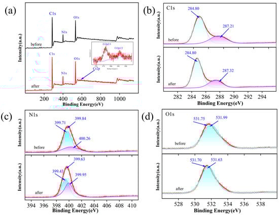 The results of the adsorption experiments, along with the zeta potential plots, indicate the presence of electrostatic interactions in the adsorption process. The adsorption simulation curves further reveal that chemisorption predominates, driven by the protonation of functional monomers on the adsorbent and the ionization hydrolysis of the target metal ions. To delve into the adsorption mechanism from a bonding perspective, X-ray photoelectron spectroscopy (XPS) was utilized to analyze the adsorbent’s specific binding sites before and after adsorption. The distinctive peaks of Cr(VI) were clearly discernible in the wide-scan spectrum both before and after adsorption, with peaks at 577.9 eV and 587.6 eV corresponding to the characteristic absorption peaks of Cr 2p 2/3 and Cr 2p 1/2, respectively, underscoring the adsorbent’s affinity for Cr(VI) (Figure 8a). The subsequent reverse convolution analysis of the C 1s spectrum revealed a slight shift in the C=N peak from 287.21 eV to 287.32 eV post-adsorption, while the C-C peak remained unchanged at 284.80 eV (Figure 8b). The N 1s spectrum exhibited peaks at 399.71 eV and 400.26 eV for N-C and NH+ pre-adsorption, which shifted to 399.43 eV and 399.95 eV, respectively, post-adsorption (Figure 8c). In the reverse convolution spectrum of O 1s, the O-Cr peak shifted from 531.99 eV to 531.63 eV after adsorption (Figure 8d). These findings suggest that the adsorption of Cr(VI) on the ion-imprinted polymer (IIP) involves interactions between N atoms on the IIP and O and Cr atoms in the metal ions [42,43,44].