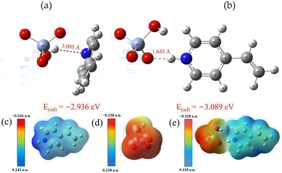 (a,b) 4VP and protonated 4VP vs. HCrO4− binding energies and bond lengths, (c−e) protonated 4VP, HCrO4−, and their product’s surface electrostatic formulas.