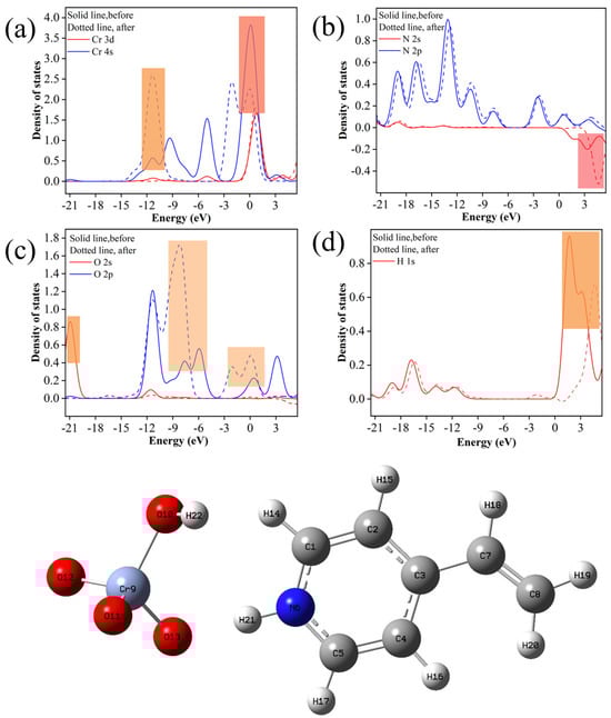 To investigate the electron transfer during adsorption, the analysis was conducted using the projected density of states (PDOS) (Figure 11). Following adsorption, the Cr 4s orbitals experienced a shift from −13.60 eV to −8.16 eV, with a notable weakening observed at −2.72 eV to 2.72 eV. Conversely, the N 2s orbitals exhibited significant strengthening at 2.72 eV to 0 eV, suggesting electron transfer occurs from HCrO4− to the N atoms. Additionally, the O 2s orbital showed a substantial weakening at −21.77 eV to −19.05 eV post-adsorption, while the 2p orbital displayed significant enhancement at −10.88 eV to 2.72 eV. Furthermore, a shift in the 1s orbital of H from −2.72 eV to 5.44 eV was observed after adsorption, indicating the formation of bonds between O and H atoms, thereby enhancing the stability of the adsorption product. The electron transfer observed during adsorption implies that the process proceeds via chemisorption [46].