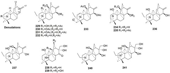 Compounds 38–40, obtained from Aconitum, are classified as ranaconitine-type DAs. Kirisine A (40) and B (38) are rare DAs with 9,14-methylenedioxy group. In addition, kirisine B (38), containing a chlorine substituent at C-4, represents a fourth example of DAs with a chlorine substituent [35].