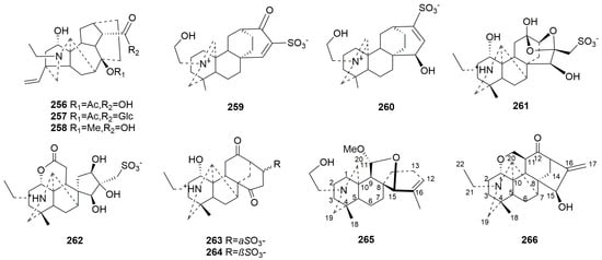 - Guo, Q.; Xia, H.; Wu, Y.; Shao, S.; Xu, C.; Zhang, T.; Shi, J. Structure, property, biogenesis, and activity of diterpenoid alkaloids containing a sulfonic acid group from Aconitum carmichaelii. Acta Pharm. Sin. B 2020, 10, 1954–1965. [Google Scholar] [CrossRef]