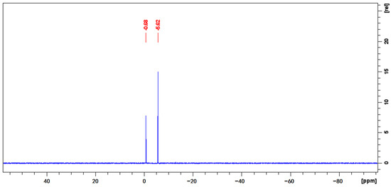 In the 31P-qNMR spectrum illustrated in Figure 4, the phosphorus signal of monocrotophos is detected at −5.62 ppm, while TnPP is observed at −0.68 ppm. These signals represent the only peak within their specific regions, ensuring clear identification and separation from any potential signal overlaps. The significant peak symmetry observed in both signals is crucial for achieving accurate integration, which is a cornerstone for reliable qNMR analysis. The selection of these specific phosphorus peaks for the quantification process aligns with the principle of choosing distinct, non-overlapping signals to ensure the highest levels of accuracy in qNMR purity evaluations. The application of Equation (2) yielded a calculated purity of 993.5 mg/g for TnPP (Table S4). This result was consistently replicated in seven measurements, resulting in a remarkably low RSD of 0.11%. It is crucial that the application of 31P-qNMR avoids interferences, yields a single and sharp phosphorus peak, and is consistent with the result of 1H-qNMR.