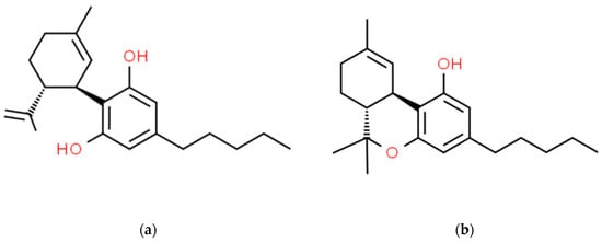 Chemical structures of CBD (a) and THC (b).
