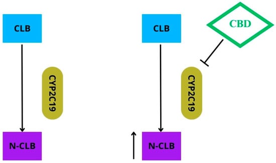 In clinical conditions, CBD, in accordance with the FDA and EMA approvals, is used as an add-on therapy with other antiepileptic medications. In children with LGS and DS, the most effective and commonly used antiseizure drug seems to be clobazam. Noteworthily, CBD proved to be more effective when combined with this drug. The interactions between the two active substances appear to be primarily pharmacokinetic. CBD inhibits the function of the cytochrome CYP 2C19 and thus also the metabolism of clobazam, leading to around a three-fold increase in the plasma concentrations of N-desmethylclobazam (N-CLB), the active metabolite of clobazam (see Figure 3).