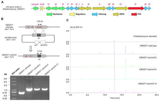 3.4. Gene Replacement of chmO in S. sp. CB00271