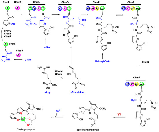 - Crooke, A.M.; Chand, A.K.; Balskus, E.P. Elucidation of chalkophomycin biosynthesis reveals N-hydroxypyrrole-forming enzymes. bioRxiv 2024. [Google Scholar] [CrossRef]