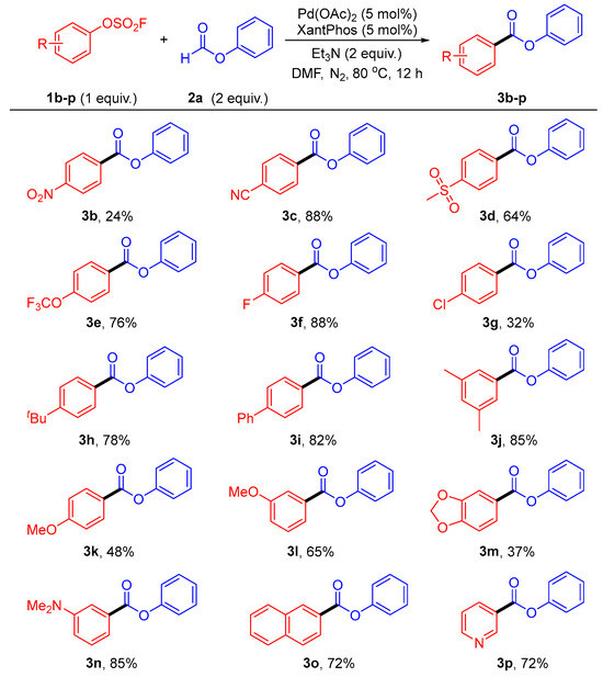 With the establishment of the optimal reaction conditions for the coupling reactions (Table 1, entry 12), we proceeded to examine substrate scope of the reaction by employing a range of structurally diverse aryl fluorosulfates. As illustrated in Figure 1, aryl fluorosulfates 1b–n possessing either electron-withdrawing group or electron-donating substituent in the aryl ring efficiently underwent the cross-coupling with phenyl formate (2a) to produce the anticipated ester 3b–n in 24–88% yields. In addition, naphthyl-substituted fluorosulfate 1o worked equally well with 2a under established conditions to give the product 3o in 72% yield. Moreover, fluorosulfate 1p derived from pyridine was proven to be a suitable candidate for the current esterification, providing the desired product 3p in 72% yield. Notably, functional groups or substituents, including nitro, cyano, methylsulfonyl, trifluoromethoxy, fluoro, chloro, t-butyl, phenyl, methyl, methoxy, N,N-dimethyl, and [1,3]dioxolyl, were well-tolerated in the reaction, which could be retained for downstream derivatization. However, when sterically congested 2,6-dimethyl phenyl fluorosulfate was employed as a coupling partner, none of the desired cross-coupled product was obtained, presumably because of the inherent steric hindrance in the substrate.