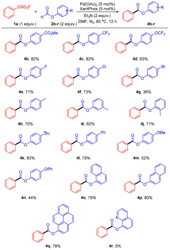 Apart from the above-mentioned coupling electrophiles (e.g., aryl halides and thianthrenium salt), aryl fluorosulfates as readily available and shelf-stable reagents have been demonstrated to be efficient electrophiles for undergoing a wide variety of organic transformations [48,49,50,51,52,53,54,55,56,57,58,59,60]. Generally, aryl fluorosulfates could be conveniently synthesized from the reactions of phenols with very cheap SO2F2 under weakly basic conditions (using Et3N as a base) with almost quantitative yields, and they showed higher reactivity than the corresponding aryl triflates, mesylates, and tosylates, serving as an attractive alternative to conventional aryl halides and pseudohalides [48,49]. Although several cases with the use of aryl fluorosulfates as substrates for palladium-catalyzed carbonylation have been developed, in most cases, dangerous CO gas was employed as a carbonyl source [61,62,63,64,65,66]. Thus, the development of an alternative method for the carbonylation of aryl fluorosulfate is still highly demanded. In the continuation of our efforts in developing efficient organic reactions with the use of alternative electrophiles [67,68,69,70,71,72,73,74,75,76,77,78,79], herein we report a palladium-catalyzed carbonylation of aryl fluorosulfate with aryl formate for the efficient access to ester (Scheme 1c).