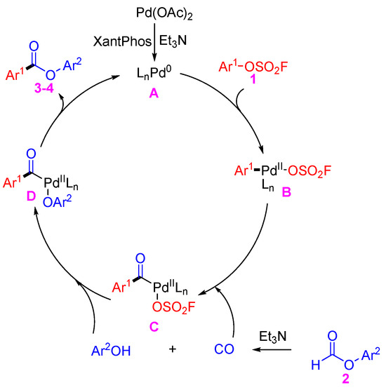 Based on previous reports [16,17,18,19,20,21,22,23,24,25,26,27,28], a possible reaction mechanism was proposed (Figure 4). Initially, active zero-valent palladium species (LnPd0) A, which is in situ generated in the reaction system, inserts into aryl fluorosulfate 1 to give an arylpalladium(II) intermediate B. On the other hand, carbon monoxide (CO) and phenol (Ar2OH) are in situ produced from aryl formate 2 under the action of Et3N. Next, the insertion of CO into organopalladium B gives an acylpalladium(II) species C, which undergoes exchange with phenol (Ar2OH) to obtain the corresponding phenoxy(acyl)palladium intermediate D. Finally, a reductive elimination of intermediate D occurs to furnish the desired product 3-4, along with the re-production of palladium species A, which enters the next catalytic cycle.