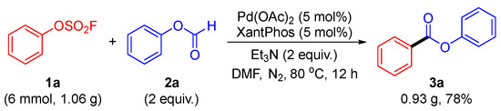 Finally, the current palladium-catalyzed carbonylation of aryl fluorosulfates with aryl formates was found to be amenable to gram-scale synthesis. As shown in Scheme 2, the 6 mmol-scale reaction using 1.06 g of aryl fluorosulfates 1a as substrate proceeded equally well under well-established conditions to give the product 3a in 78% yield.