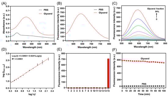 (A) Absorption spectra and (B) fluorescence spectra of TCF-VIS1 (10 μM) in PBS and glycerol. (C) Fluorescence spectra of TCF-VIS1 at different glycerol fractions in the glycerol–water system. (D) Linear relationship between log I644 nm and log η in the viscosity range of 2.15 cp–163.6 cp. (E) Fluorescence intensity of 10 μM TCF-VIS1 for different species (100 μM) at 644 nm: (1) PBS; (2) NO2−; (3) K+; (4) Mg2+; (5) Ca2+; (6) HCO3−; (7) Fe2+; (8) Glu; (9) Cys; (10) BSA; (11) GSH; (12) Urea; (13) H2S; (14) H2O2; (15) Glycerol. (F) The photostability of the probe TCF-VIS1 in glycerol and PBS. λex = 460 nm, λem = 644 nm.