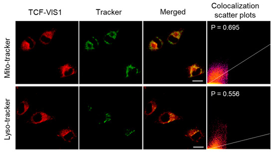 Fluorescent confocal images of HepG-2 cells with TCF-VIS1 and a tracker. TCF-VIS1: λex = 488 nm, λem = 600~750 nm. Tracker: λex = 488 nm, λem = 500~520 nm. Merge: the merged images of the green channel and the red channel. Colocalization scatter plots: the scatter plot of the green channel and the red channel. Scale bar: 20 μm.