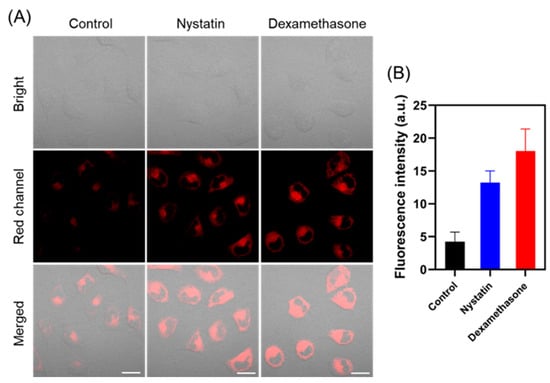 Fluorescence images of HepG-2 cells: (A) HepG-2 cells were incubated with TCF-VIS1 (10 μM) for 10 min as a control; HepG-2 cells were treated with nystatin (10 μM) or dexamethasone (10 μM) for 45 min and then incubated with TCF-VIS1 (10 μM) for another 10 min. λex = 488 nm, λem = 600~750 nm. Scale bar: 20 μm. (B) Fluorescence intensities in panel (A), which were obtained by Image J (Fiji).
