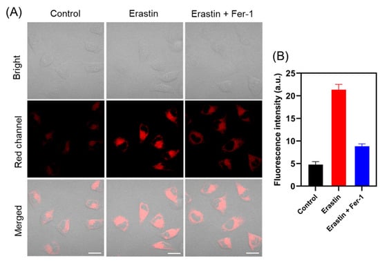 We further investigated the viscosity changes during ferroptosis, as studies have shown that during ferroptosis, the conversion of unsaturated lipids to lipid peroxides increases the cell viscosity [39,40]. As displayed in Figure 5, HepG-2 cells pretreated with erastin (a ferroptosis activator) showed an obvious 4.5-fold fluorescence enhancement in the red channel, indicating a significant increase in viscosity during ferroptosis. In addition, when HepG-2 cells were simultaneously pretreated with erastin and Fer-1 (a ferroptosis inhibitor), the fluorescence in the red channel showed little change compared with the control group, indicating that the change in viscosity was correspondingly reduced during the inhibition of ferroptosis. Therefore, the probe is expected to be used to monitor the physiological and pathological processes related to viscosity.