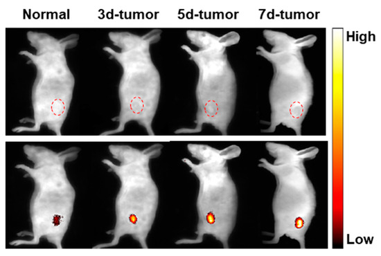 We further prepared a 4T1 tumor-bearing mouse model to study the response of TCF-VIS1 to viscosity in vivo. As displayed in Figure 7, in normal mice, the probe TCF-VIS1 exhibited only slight fluorescence. In contrast, the fluorescence at the tumor site of 4T1 tumor-bearing mice with different days was significantly enhanced, demonstrating that TCF-VIS1 could be a useful tool for visualizing tumors by monitoring viscosity in vivo.