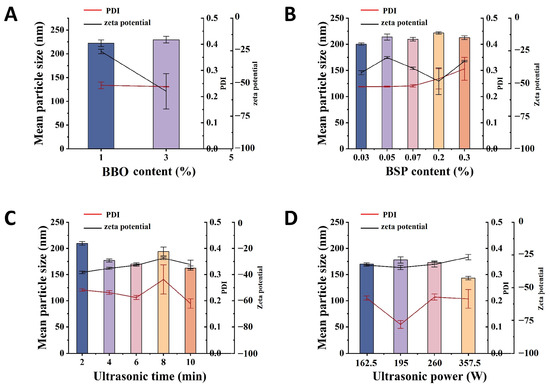 Influence of content of BBO (A), content of BSP (B), ultrasonic time (C), and ultrasonic power (D) on the changes in mean particle size, PDI, and zeta potential of the BBG-NEs using US.