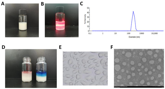 Physicochemical characterization of BBG-NEs: (A) appearance of BBG-NEs; (B) Faraday–Tyndall effect after 1000-time dilution; (C) particle size distribution diagram; (D) type identification; (E) optical microscope image; (F) TEM image.