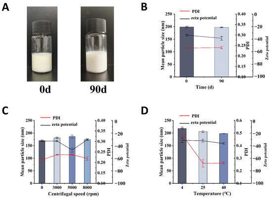 The stability studies: (A) appearance of nano-emulsions in long-term stability; (B) long-term stability; (C) centrifugal stability; (D) temperature stability.