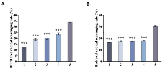 Antioxidant capacity of BBG-NEs: (A) DPPH radical scavenging capacity; (B) OH radical scavenging capacity (1. GA; 2. BSP; 3. GA + BSP; 4. BBO; 5. BBG-Nes). (Data are expressed as mean ± SEM, n = 3. *** indicates p ≤ 0.001 compared with the BBG-NEs group).