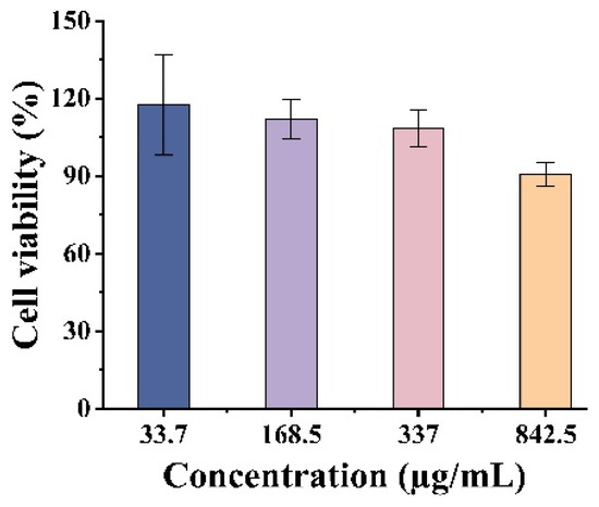 The cytotoxic effects of BBG-NEs were evaluated using the MTT (thiazolyl blue) colorimetric assay. In this assay, succinate dehydrogenase within the mitochondria of cells reduces MTT to insoluble blue-violet Formazan crystals, which are retained by living cells but not by dead ones. Dimethyl sulfoxide (DMSO) is used to solubilize the Formazan within the cells, and the resulting absorbance is used to indirectly quantify the number of viable cells. The amount of Formazan crystals formed is directly proportional to the number of cells within a specific range. Figure 6 illustrates that the cell viability of fibroblast L929 remained above 90% when the concentration of BBG-NEs was between 33.7 and 842.5 µg/mL. These findings suggest that BBG-NEs demonstrate a high level of biosafety towards L929 cells.