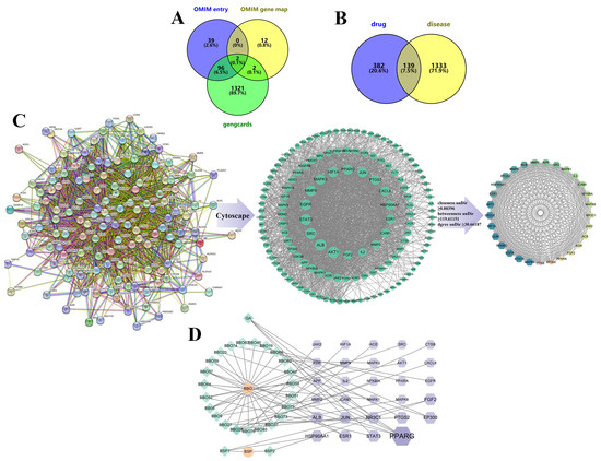 Core targets screening and PPI diagrams: (A) Venny diagram of wound-healing targets from different databases; (B) Venny diagram of drug ingredients and trauma repair targets; (C) PPI diagrams of targets: string establishes a PPI network, imports cytoscape and then goes through centiscape screening to obtain the core target; (D) drug–component–target network, with green diamond-shaped nodes representing ingredients in the formulation, purple hexagonal nodes representing trauma repair-related targets, and orange circular nodes representing the drugs. The larger the area of the node graph and the darker the color, the larger the DEGREE value of the component.