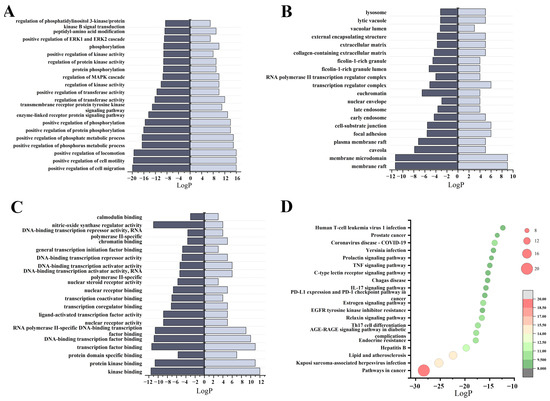 KEGG and GO enrichment results: (A) diagram of the top 20 biological process category terms based on GO BP enrichment analyses; (B) diagram of the top 20 cellular component category terms based on GO CC enrichment analyses; (C) diagram of the top 20 molecular function category terms based on GO MF enrichment analyses; (D) bubble plots of the top 20 pathways based on KEGG enrichment analyses.