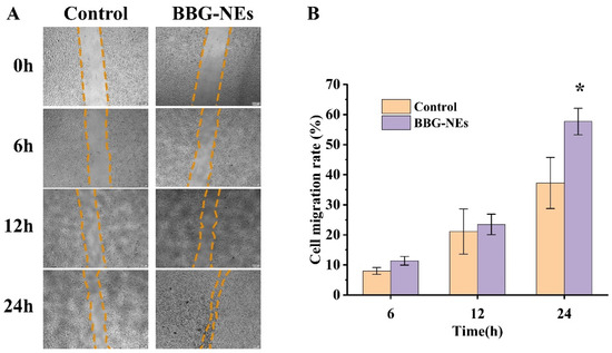 Cell scratch assay: (A) images of 0 h, 6 h, 12 h, and 24 h cell layer wounds showing the scratch width of BBG-NE effect on the migration ability of L929 cells; (B) degree of wound healing of BBG-NE-treated L929 cells. * p < 0.05, n = 3.