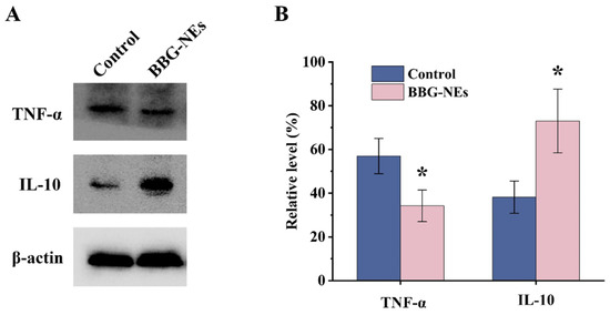 L929 cells were collected after 24 h of treatment with BBG-NEs, lysed, centrifuged at 4 °C for 10 min, and stored at −80 °C until use. Total proteins were separated by 10% SDS-PAGE, and the proteins in the gel were transferred to a PVDF membrane. Proteins were then incubated overnight at 4 °C with primary antibodies (including TNF-α and IL-10). Then, proteins were incubated with secondary antibody at room temperature for 1 h. Immunoreactive protein bands were imaged using a fully automated chemiluminescence image analysis system with β-actin as an internal reference. Finally, quantitative analysis was performed using the ImageJ software package to determine the gray scale values of the protein bands.