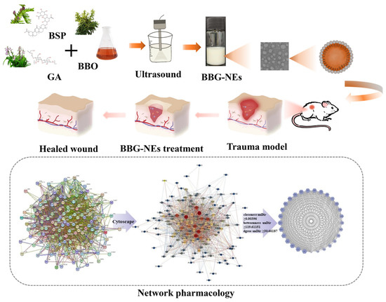This research yielded stable, well-distributed multifunctional novel NEs (BBG-NEs) via US method with BSP and GA as natural emulsifiers and BBO as natural oil phase. The BBG-NEs had a particle size of 170.2 ± 2.39 nm and a PDI of 0.212 ± 0.008. NE encapsulation significantly improved the transcutaneous permeation of BBO and enhanced its DPPH and hydroxyl radical scavenging abilities. Interestingly, BBG-NEs exhibited better wound-healing-promoting effect compared with naked BBOs and emulsifiers. After 14 days of treatment, rat wounds were basically completely healed, with intact hair growth around the wounds and almost restored pre-traumatic morphology. Network pharmacology and molecular docking results showed that 26 core components 29 potential targets were screened out. BBG-NEs may promote wound healing by affecting IL-17, AGE-AGEs, and lipid and atherosclerosis signaling pathways as well as pivotal targets like AKT1, CXCL8, and EGFR. Cell scratch and Western blotting assays showed that BBG-NEs had a migration-promoting effect on fibroblast L929 cells, as well as inhibiting the expression of TNF-α and promoting the expression of the anti-inflammatory factor IL-10. However, validation experiments of the network pharmacology and molecular docking results still need to be further investigated. This study can offer novel insights and practical guidance for the development of innovative multi-functional NEs utilizing natural emulsifiers.