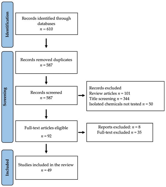 In the course of our database search, a total of 610 articles were initially identified (Figure 1). Upon removing duplicate entries (n = 587), 495 studies were subsequently excluded due to their classification as review articles or because the studies focused solely on crude extracts without evaluating isolated bioactive substances. Consequently, we scrutinized 92 full-text articles for eligibility, ultimately excluding 43. Our final dataset comprised 49 studies investigating the immunomodulatory activity of African medicinal plants.